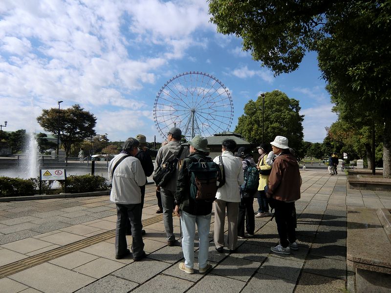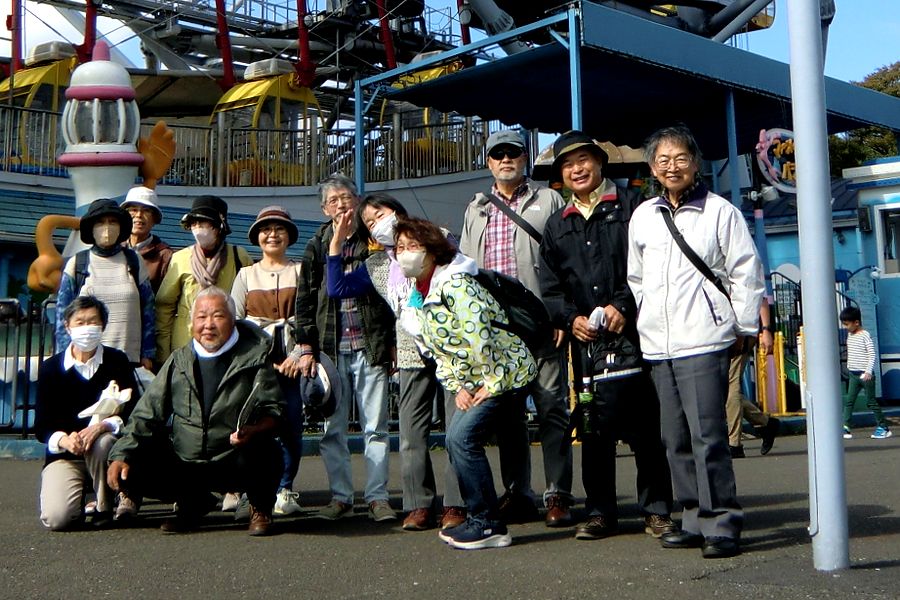 10月28日、久々の秋晴れ (普段の行いが良いのか???)。男性7名女性6名計13名の参加。行先は葛西臨海公園。今回は有楽町線新木場駅集合。大体の方が小手指始発の電車に乗り、又、途中乗車して新木場まで。11時頃待ち合わせの新木場に着き、武蔵野線1駅乗って葛西臨海公園へ。 [マップ: