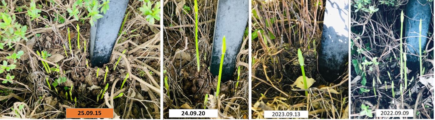 今年の夏は暑かった。去年よりも暑い。でも来週はお彼岸、涼しくなることを期待したい。玄関先の植え込みのヒガンバナの様子が気になりツツジをかき分けて見てみる。ここ2-3日の雨で急に伸びたようだ。さてその伸び具合だが去年より少し早いようだ。茎は短いにもかかわらず芽の先がほのかに赤く、蕾が透けて見えている。今年は背の低いヒガンバナになりそうだ。また、芽の数が多いように思う。株が増えたということだろう。